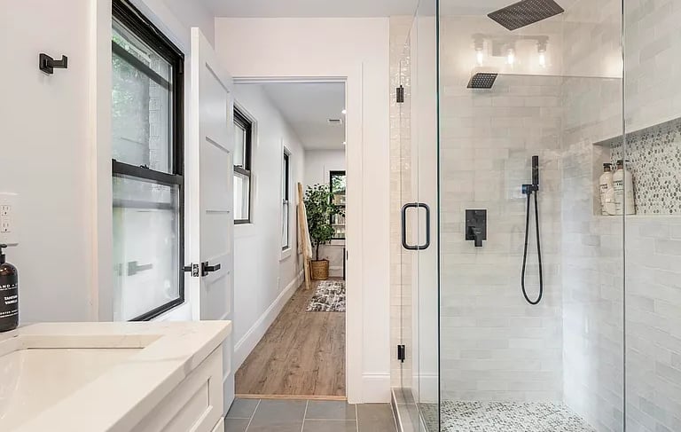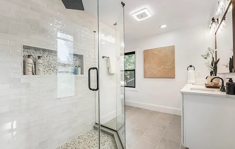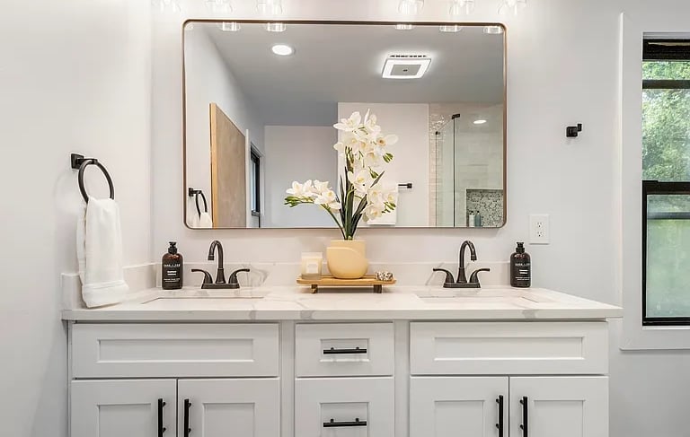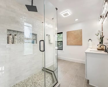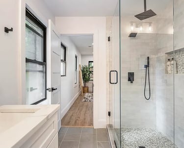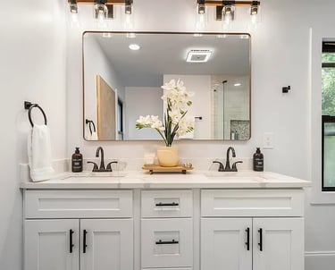 This remodel features a sleek double vanity with pristine white cabinetry and elegant black hardware, perfectly complemented by a large, frameless mirror that amplifies natural light. Custom lighting fixtures provide warm illumination, highlighting the thoughtful details throughout. From the polished countertops to the curated decor, every element was selected and installed with precision, reflecting our commitment to quality and client satisfaction.