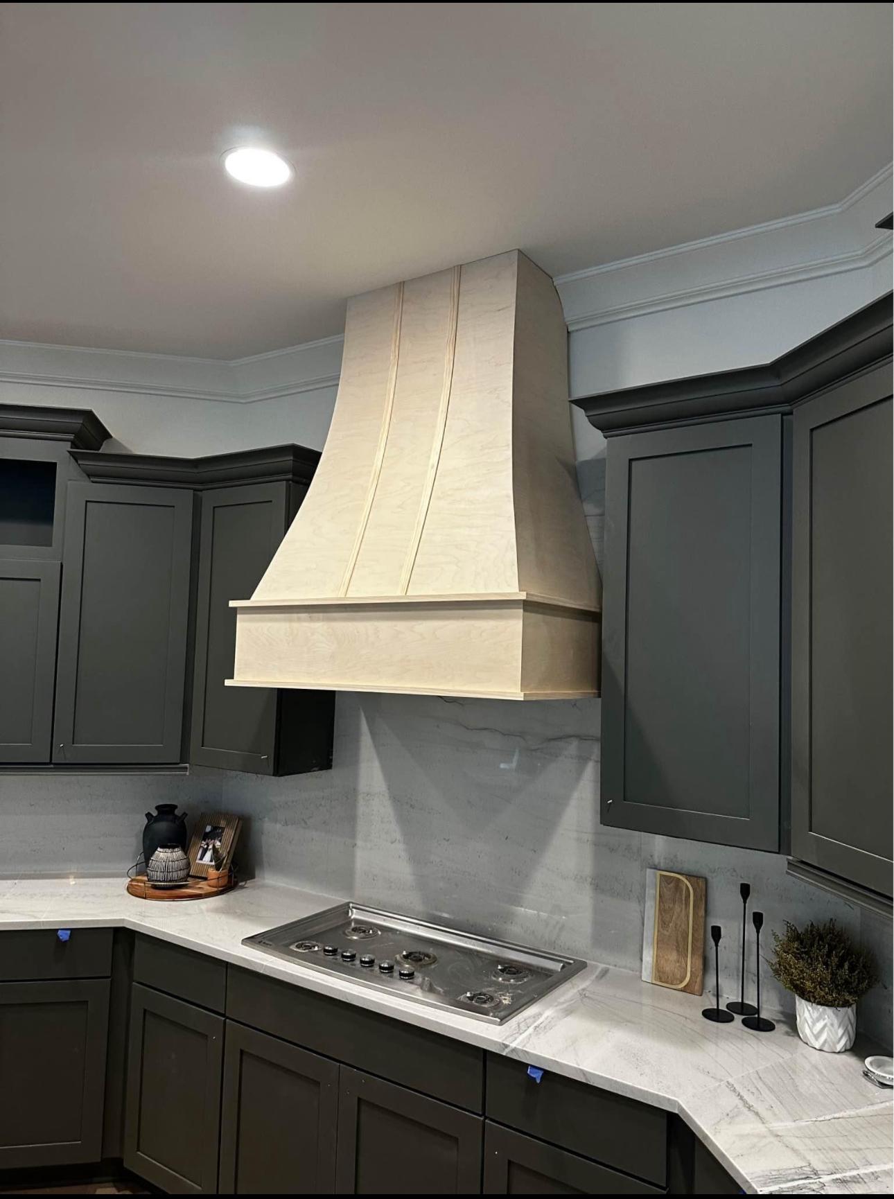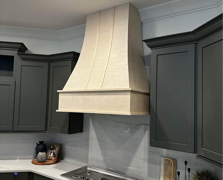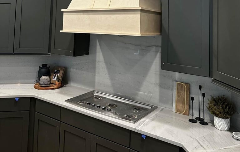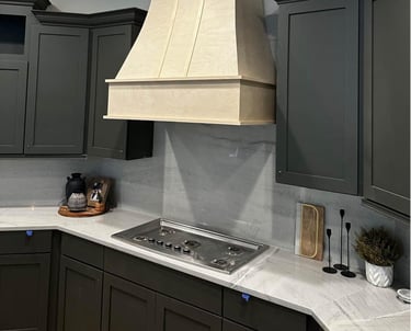 This stunning kitchen showcases our dedication to bespoke design, featuring sleek dark cabinetry, elegant countertops, and a magnificent custom stove hood that serves as both a functional necessity and a striking focal point. A thoughtfully designed hood can truly define your kitchen's aesthetic. Let us craft unique, high-quality features that make your kitchen truly yours.